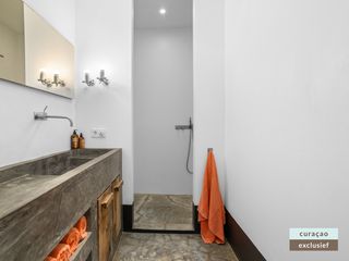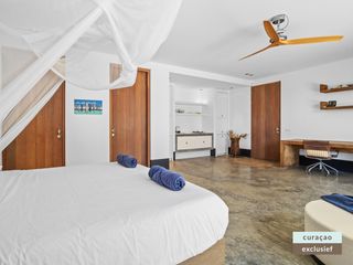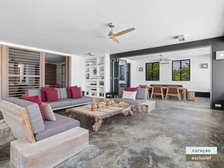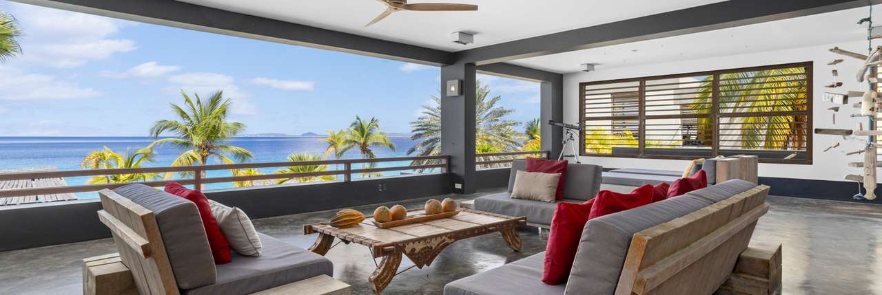 De entree van deze villa is op de eerste etage. Hier bevind zich een heerlijke woonruimte met prachtig uitzicht over de zee en Klein Bonaire. Ook is op deze verdieping de volledig ingerichte keuken met luxe apparatuur. Ook is er een klein kantoor.