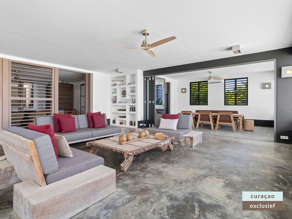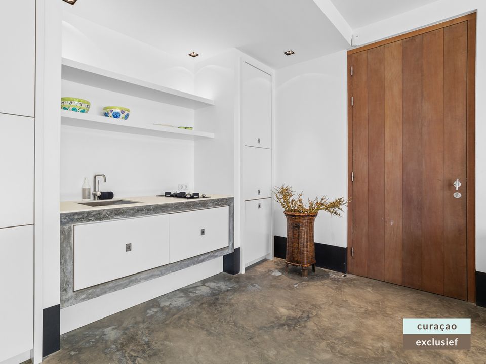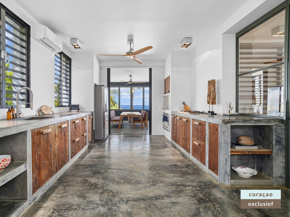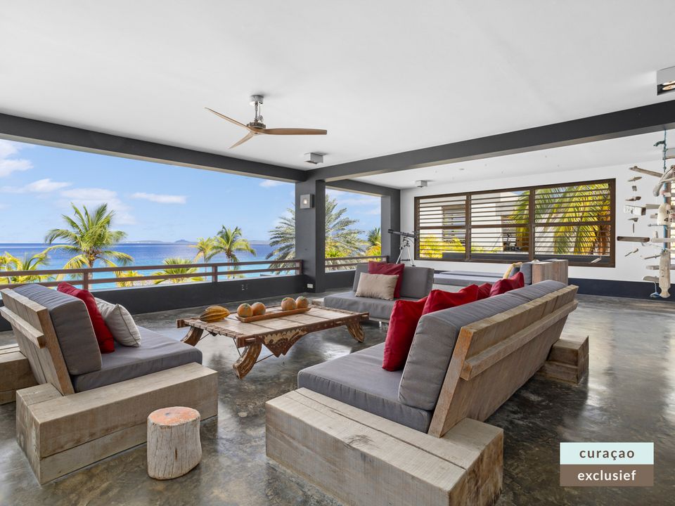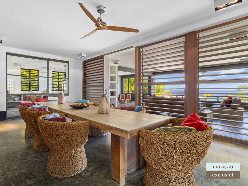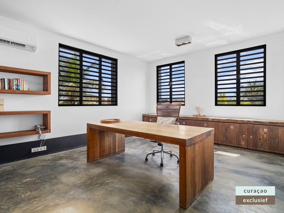 De entree van deze villa is op de eerste etage. Hier bevind zich een heerlijke woonruimte met prachtig uitzicht over de zee en Klein Bonaire. Ook is op deze verdieping de volledig ingerichte keuken met luxe apparatuur. Ook is er een klein kantoor.