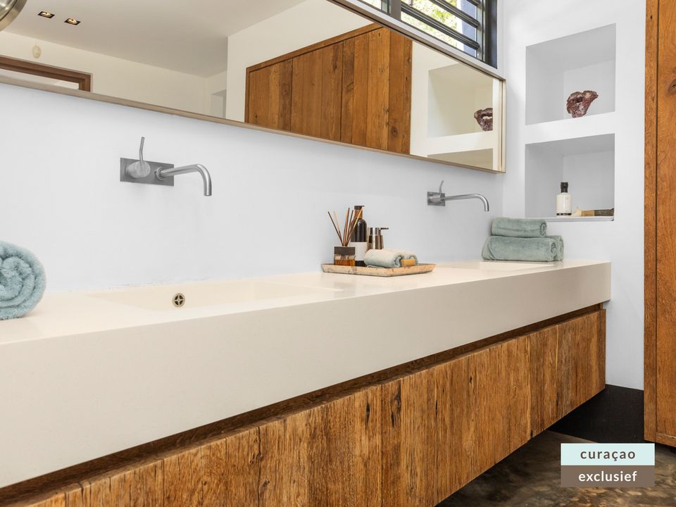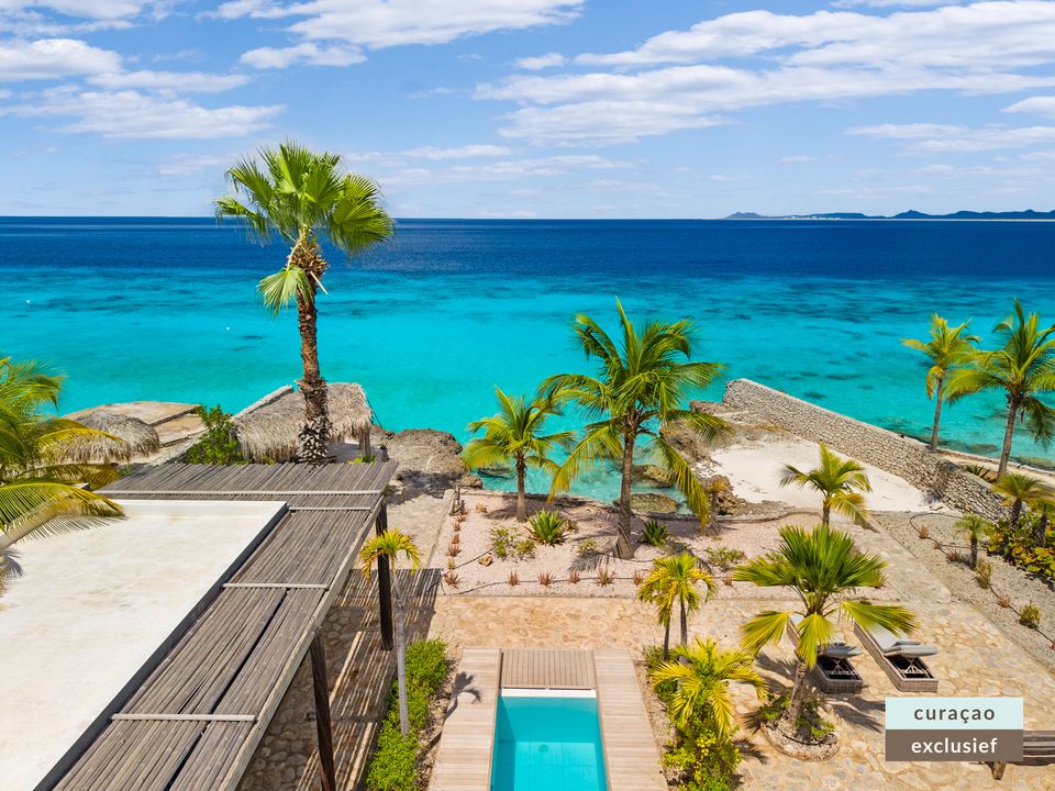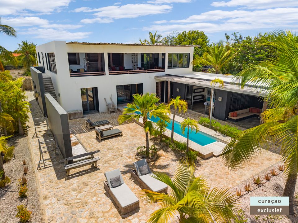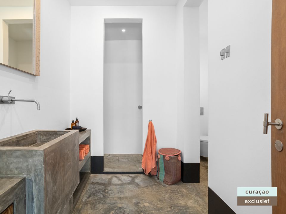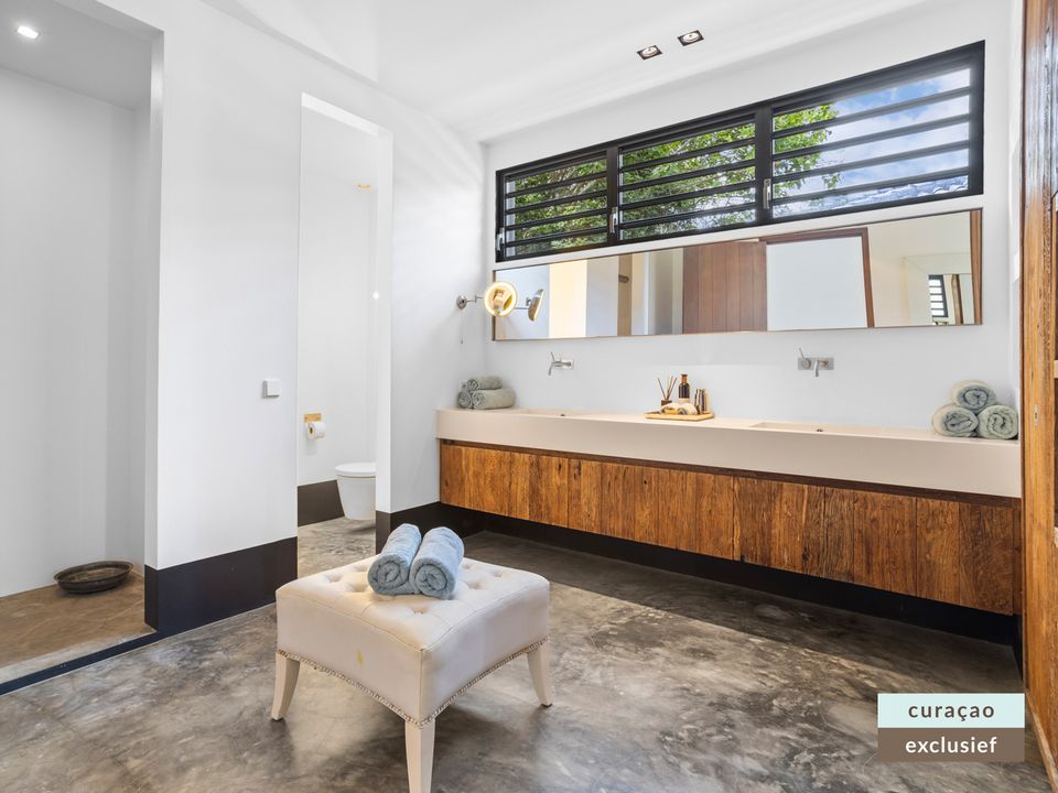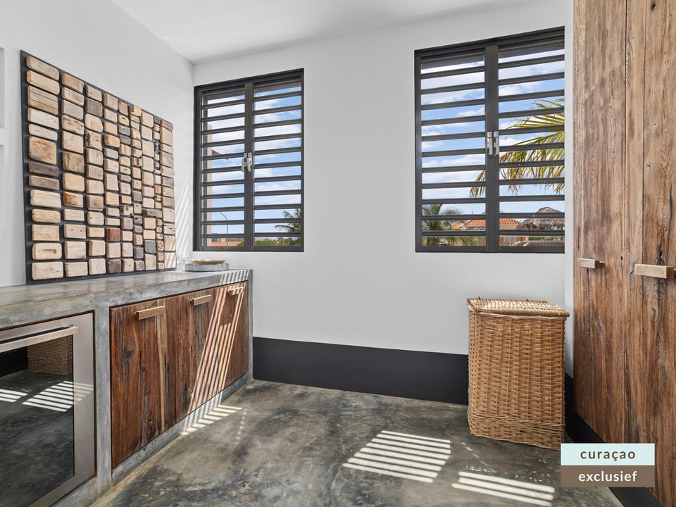 De entree van deze villa is op de eerste etage. Hier bevind zich een heerlijke woonruimte met prachtig uitzicht over de zee en Klein Bonaire. Ook is op deze verdieping de volledig ingerichte keuken met luxe apparatuur. Ook is er een klein kantoor.