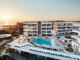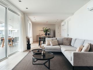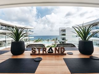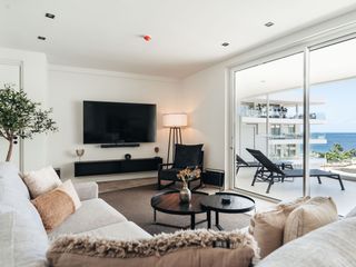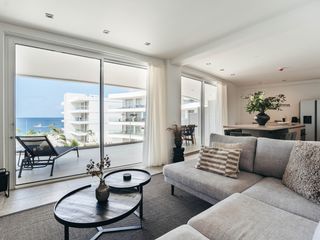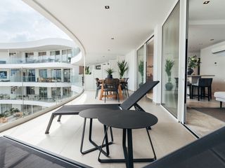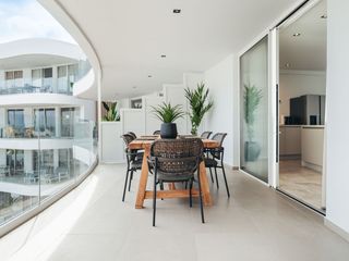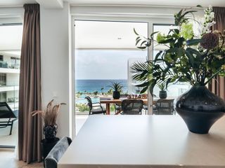 Het terras strekt zich uit over de gehele breedte van het appartement en biedt een eersteklas uitzicht op zee. Oversized glazen deuren openen de woning naar de zeelucht, waardoor de grenzen tussen binnencomfort en buitencharme vervagen. Op het terras is een eettafel te vinden en enkele ligbedden.