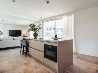 De woonkamer is voorzien van fijne loungebank met smart TV en airconditioning. De open keuken is voorzien van alle gemakken zoals o.a. een ruime koelkast, oven, magnetron, vaatwasser, Nespresso koffieapparaat plus een ontbijtbar.