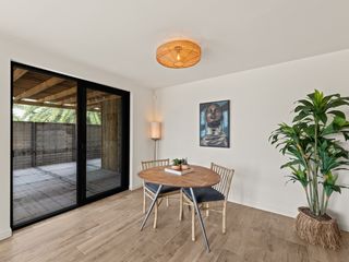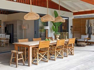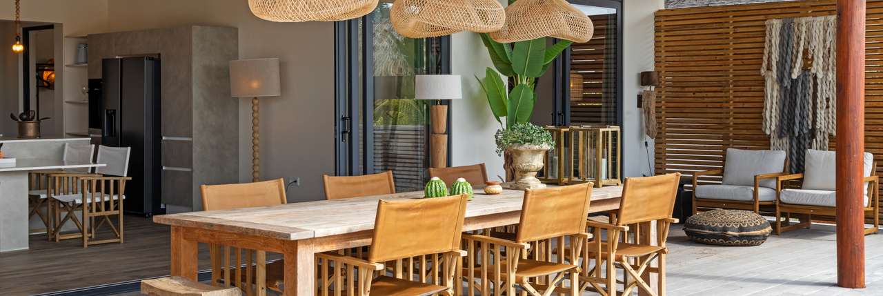Via de grote schuifpui loopt u het overdekt terras op. Daar bevindt zich een ruime buitenwoonkamer. In het midden een eettafel en daarnaast een comfortabele loungebank en loungestoelen. Met het briesje is het hier goed genieten op elk moment van de dag.