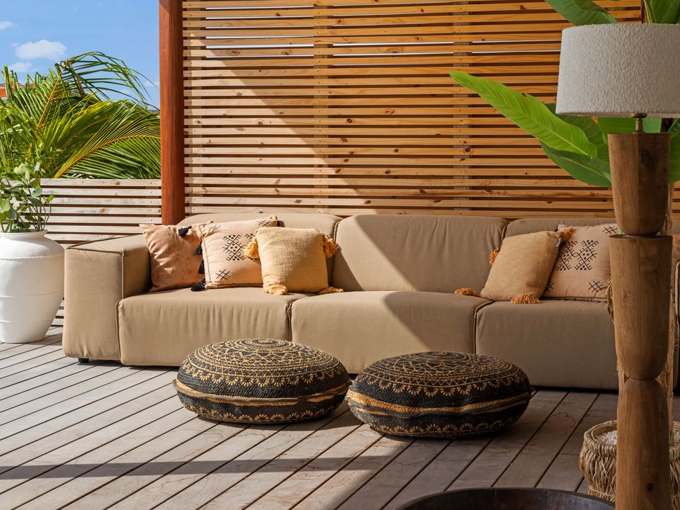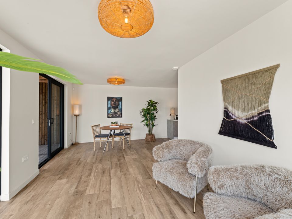 Via de grote schuifpui loopt u het overdekt terras op. Daar bevindt zich een ruime buitenwoonkamer. In het midden een eettafel en daarnaast een comfortabele loungebank en loungestoelen. Met het briesje is het hier goed genieten op elk moment van de dag.