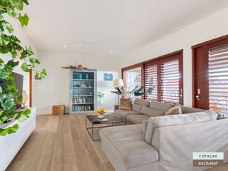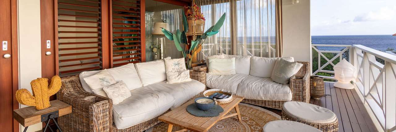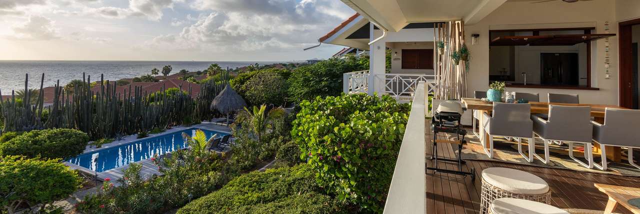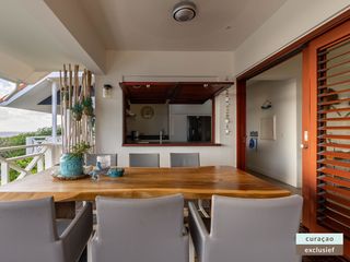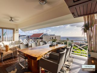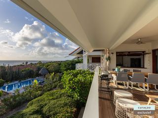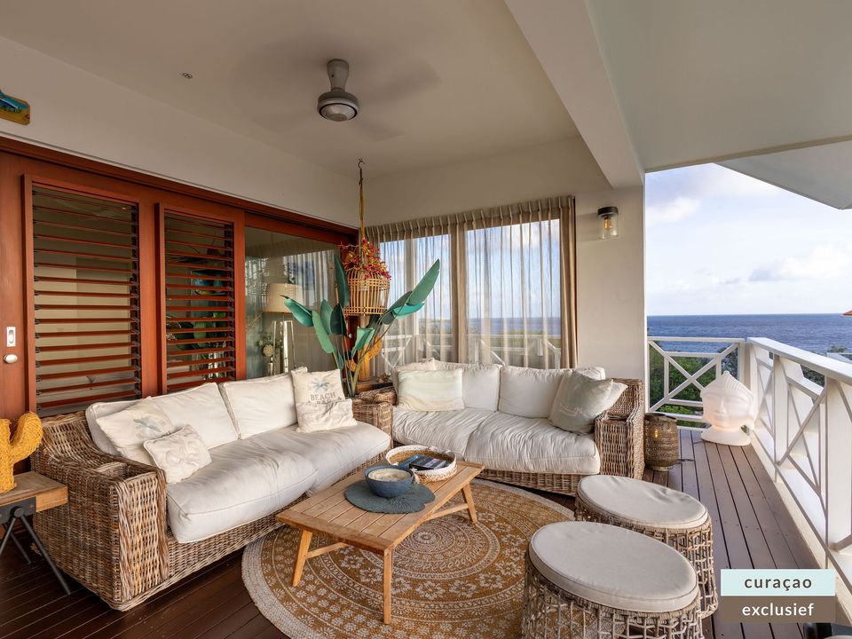 Op het royale terras met plafondfans kunt u heerlijk genieten van het spectaculaire zeezicht, zowel van voor als via de zijkant, vanaf de eettafel of vanuit de fijne loungebanken.