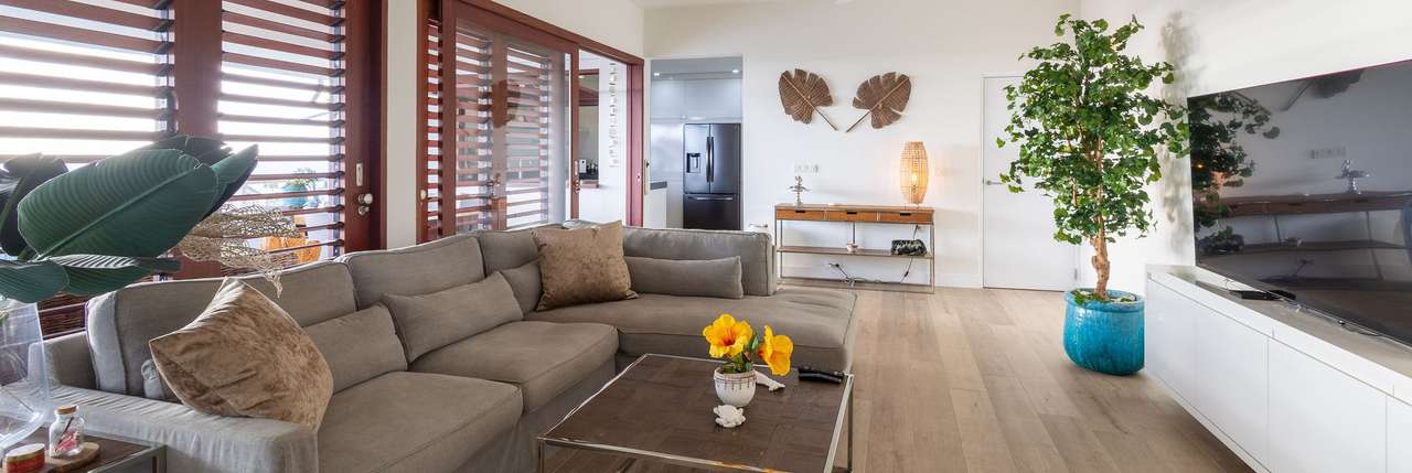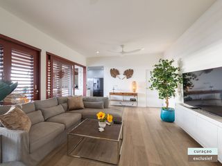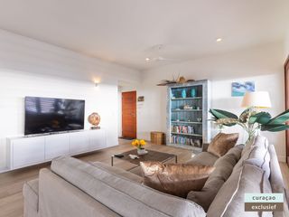 Het appartement beschikt over een grote sfeervolle woonkamer met plafondfans en met een flatscreen TV.