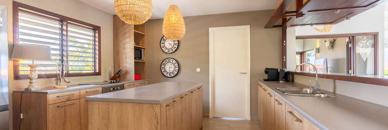 Die offene Küche ist mit allen Annehmlichkeiten ausgestattet, wie mit einem amerikanischen Kühlschrank mit separatem Gefrierfach und Eisspender, einem Ofen, einer Mikrowelle, einer Spülmaschine, einer Nespresso Maschine mit Milchaufschäumer und einer Filterkaffeemaschine, etc.