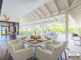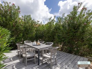 Die goße Veranda ist mit einem Esstisch für 8 Personen und einem komfortablen Loungebereich ausgestattet und bietet Zugang zum Pool.