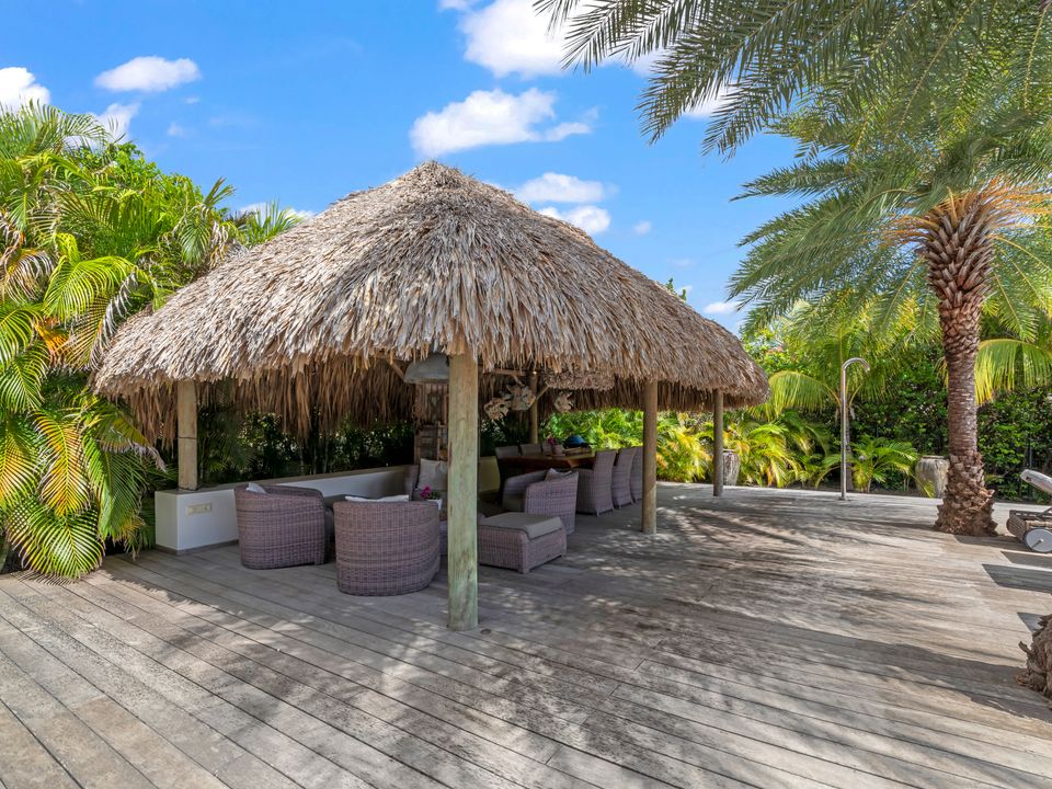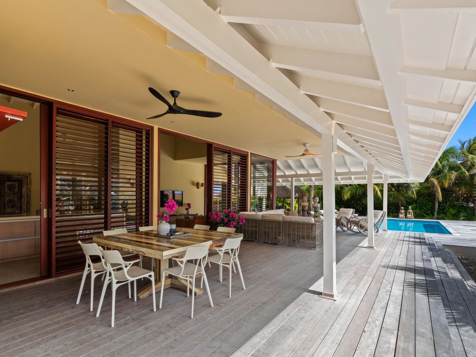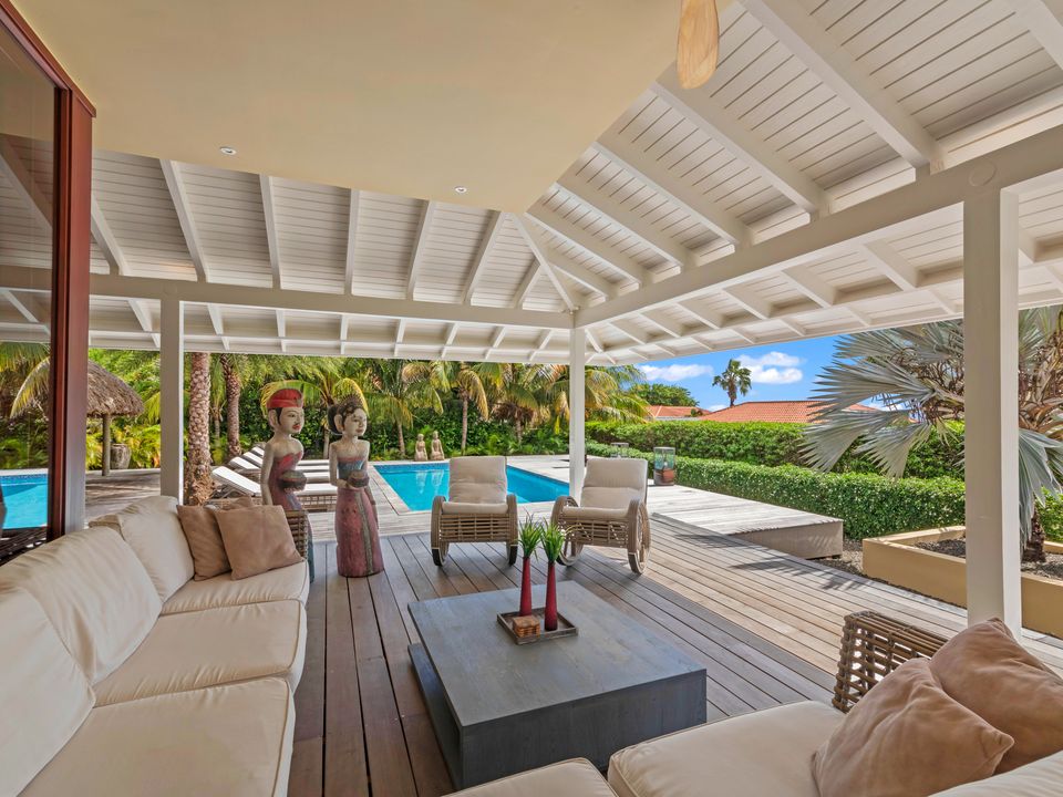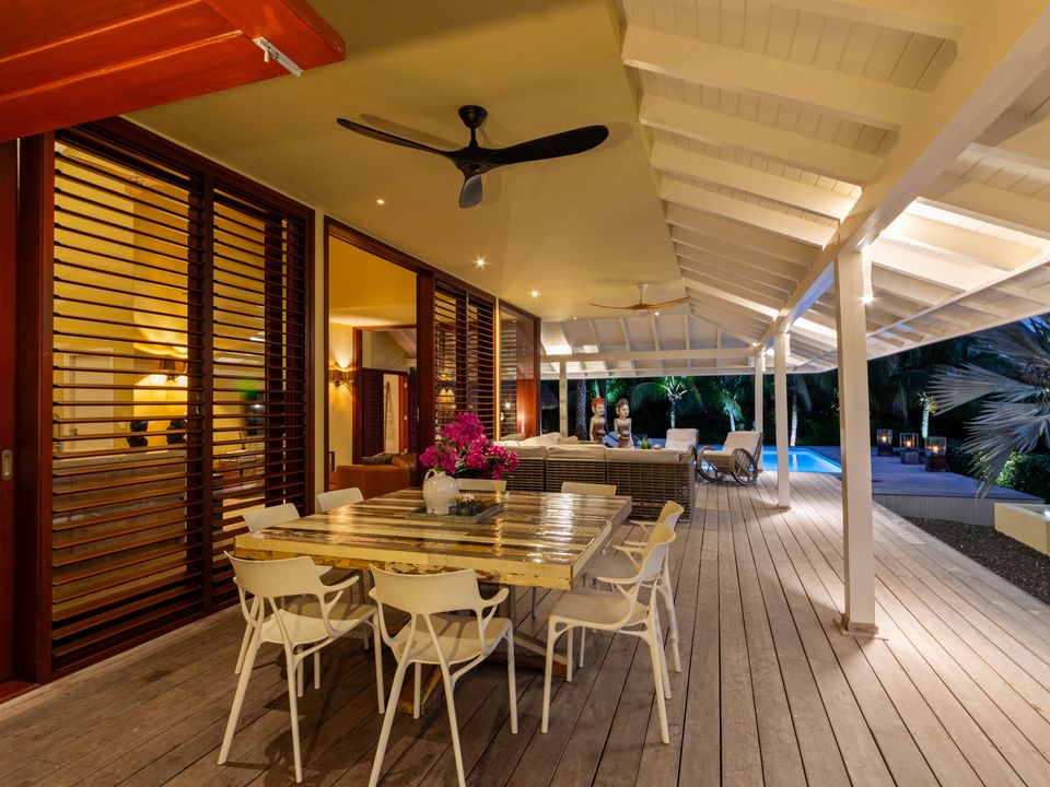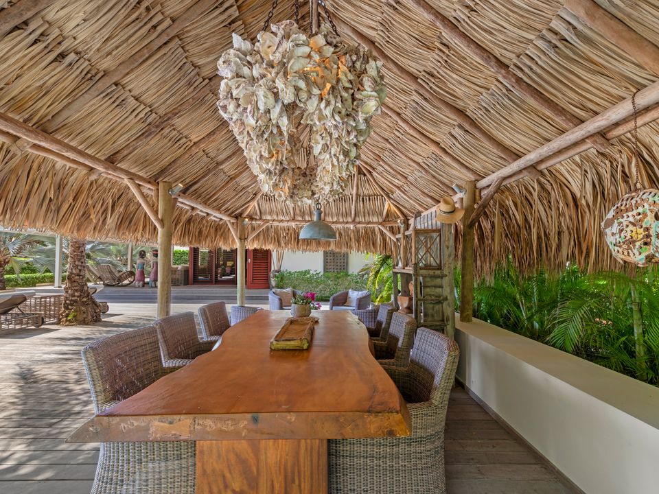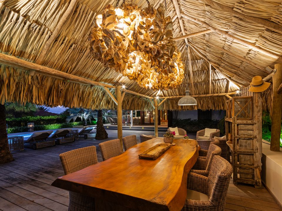 Die Veranda ist für ein luxuriöses Leben im Freien mit einem großen Esstisch und einer bequemen Lounge-Garnitur eingerichtet, damit Sie das Leben in den Tropen optimal genießen können. Der großzügige Garten verfügt über eine gemütliche Palapa, in der Sie sich wunderbar entspannen können. Am Pool gibt es eine Regendusche und 4 Liegestühle.