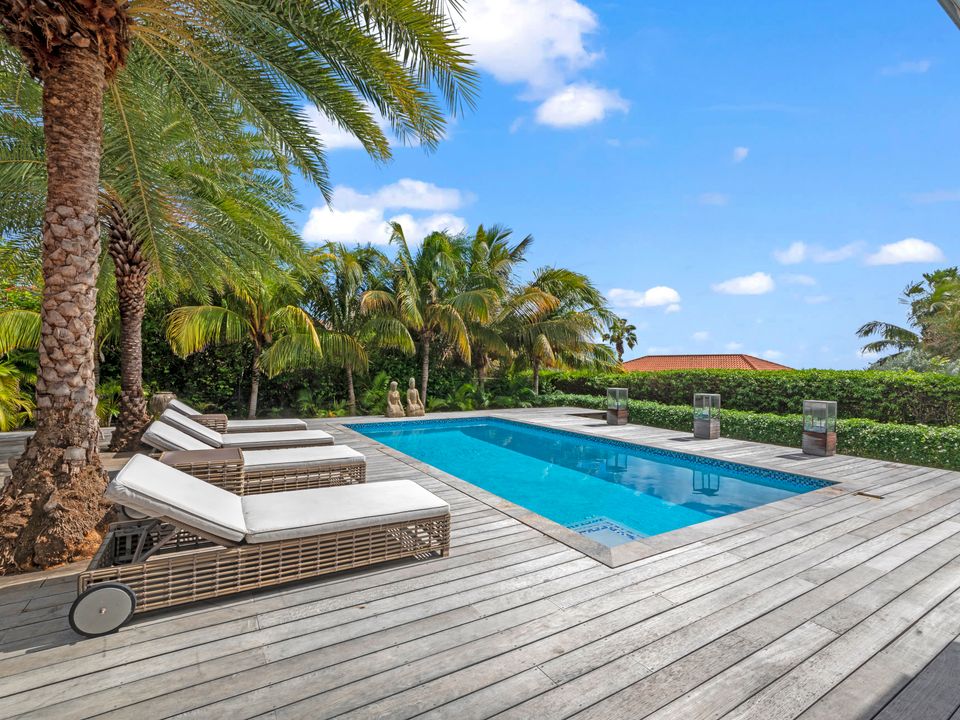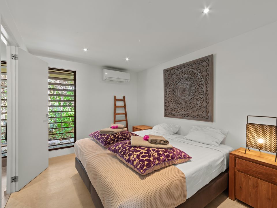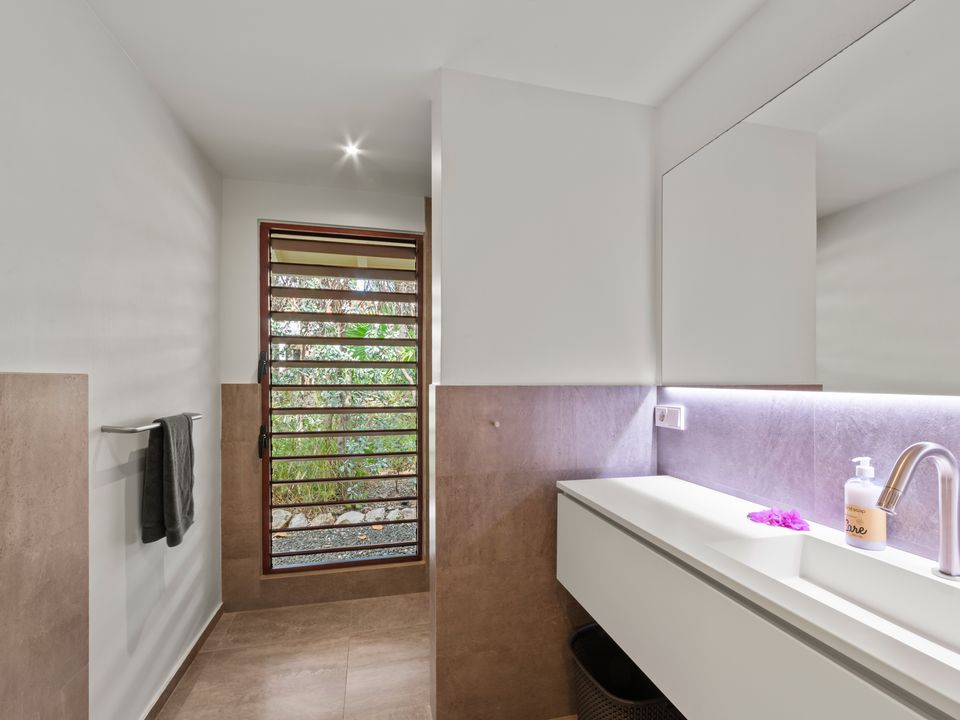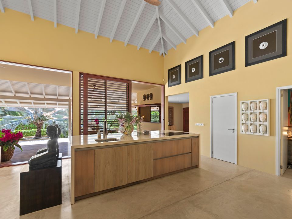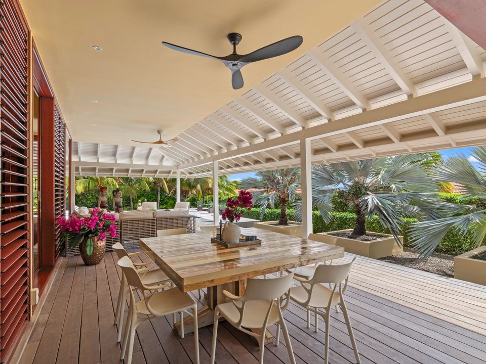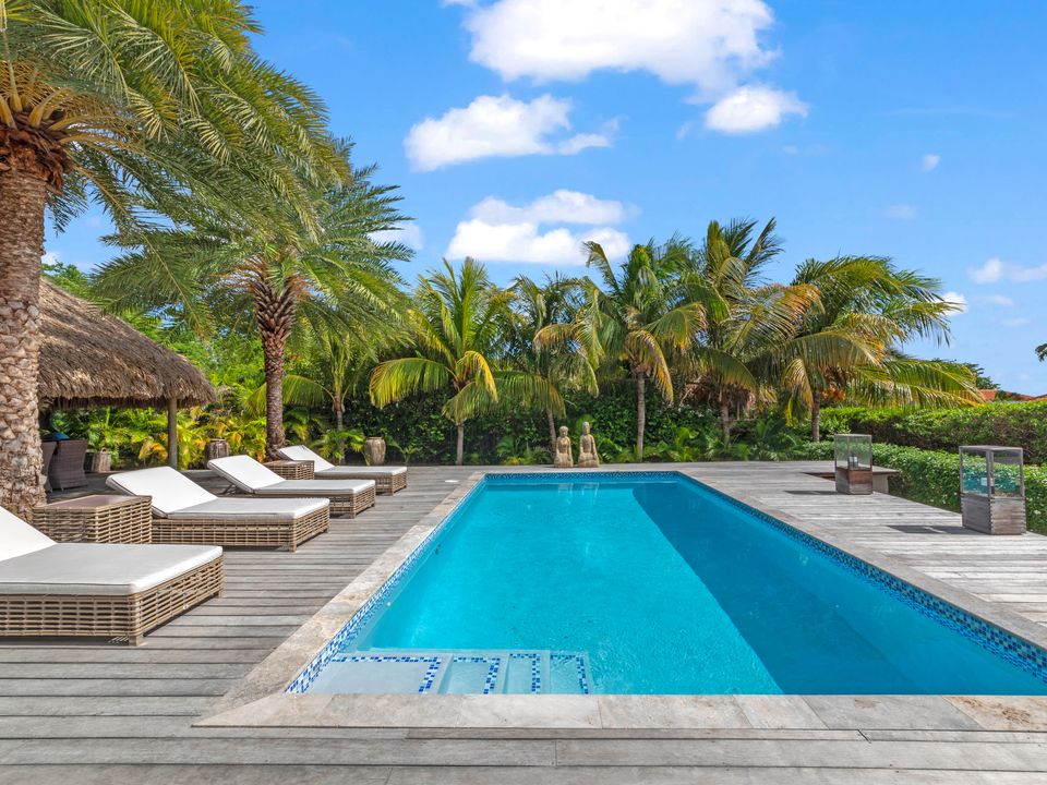 Die Veranda ist für ein luxuriöses Leben im Freien mit einem großen Esstisch und einer bequemen Lounge-Garnitur eingerichtet, damit Sie das Leben in den Tropen optimal genießen können. Der großzügige Garten verfügt über eine gemütliche Palapa, in der Sie sich wunderbar entspannen können. Am Pool gibt es eine Regendusche und 4 Liegestühle.