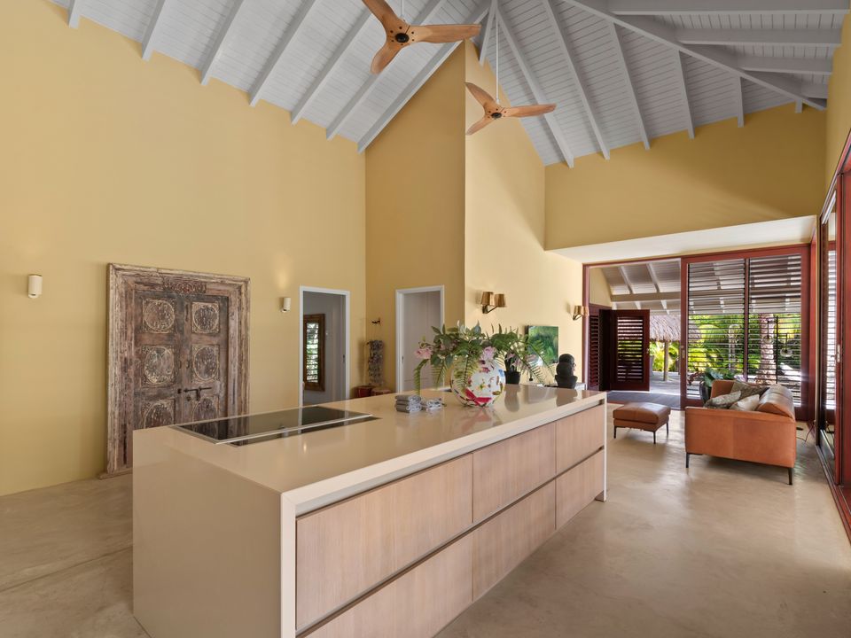 Die großzügige und offene Küche ist komplett ausgestattet und verfügt unter anderem über einen amerikanischen Kühlschrank, einen Weinkühler, einen Backofen, einen Geschirrspüler, eine Senseo- und eine Nespresso-Kaffeemaschine. Außerdem sind eine Waschmaschine und ein Trockner vorhanden.