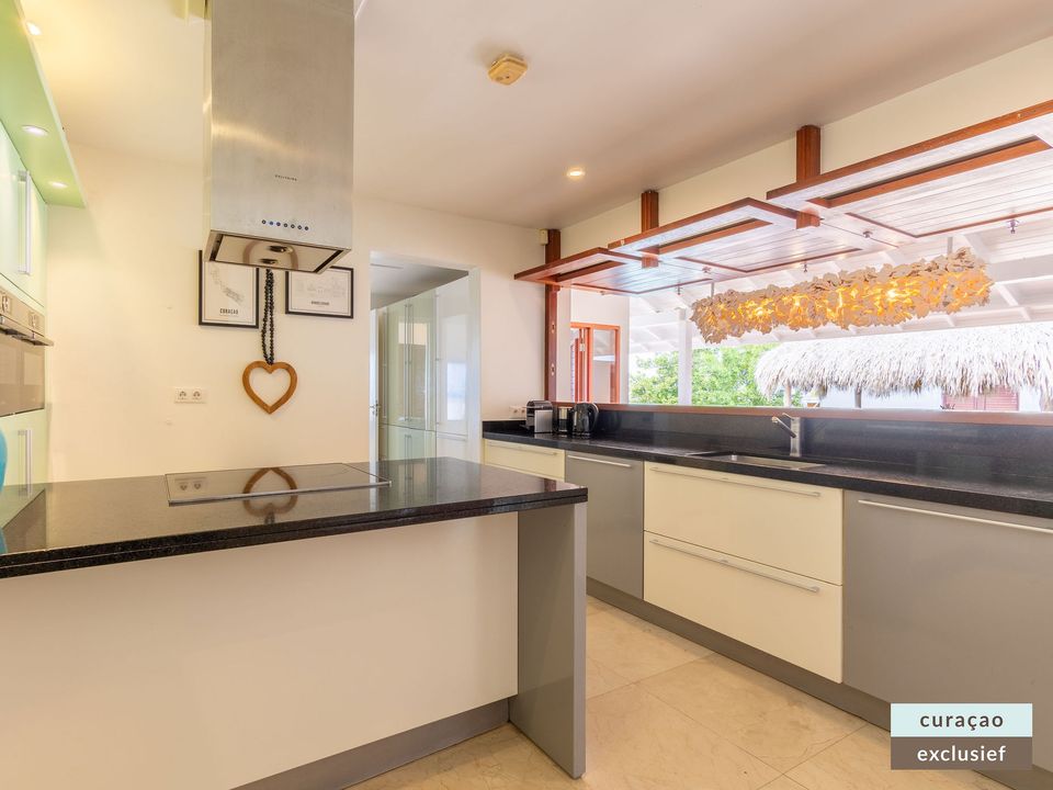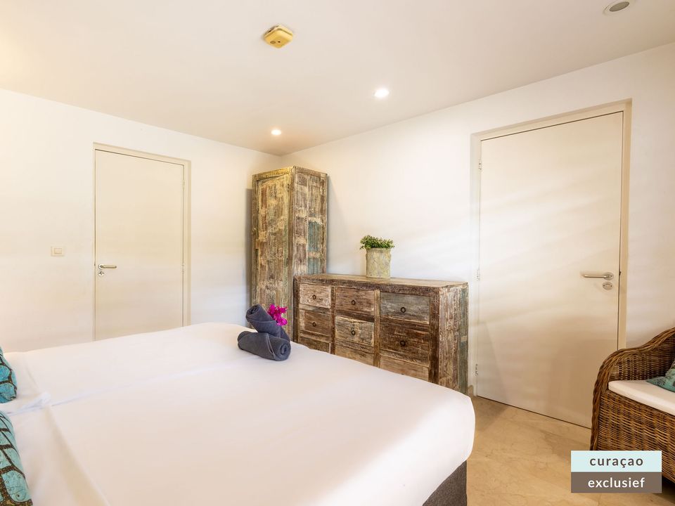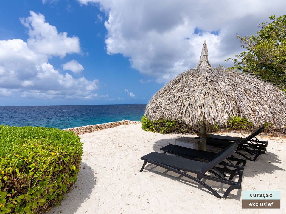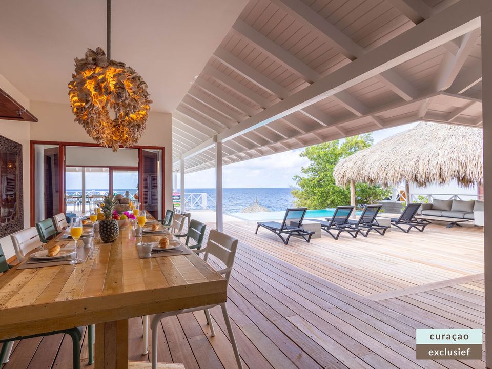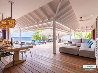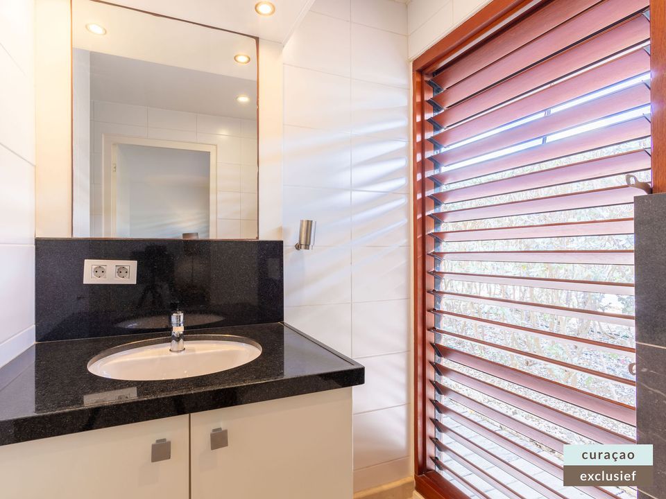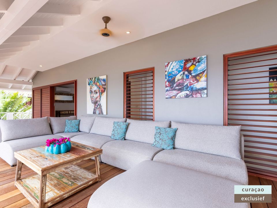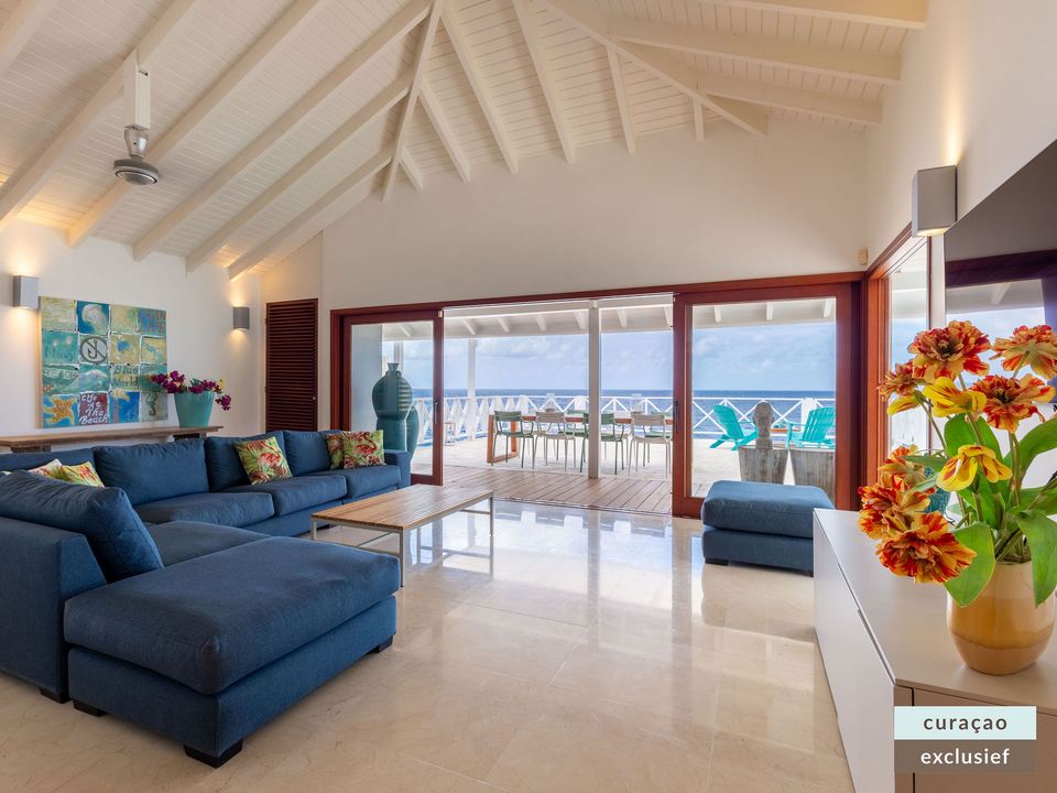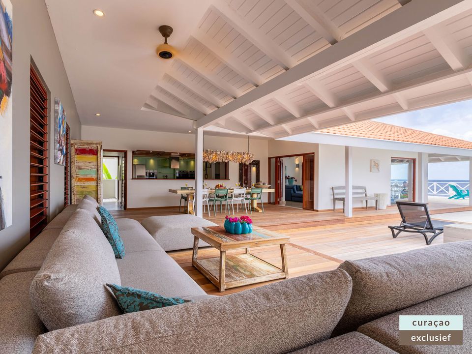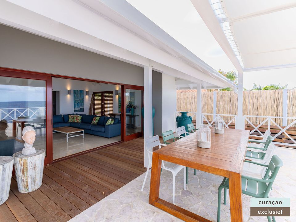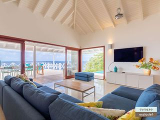 Die Villa verfügt über ein großes Wohnzimmer und ist mit einem Flatscreen TV mit Netflix und Sonos 5 Lautsprecher (tragbar) ausgestattet. Vom Wohnzimmer aus gelangen Sie auf die überdachte Veranda und die große Terrasse verfügt über eine mit Segeltuch überdachte Pergola. Von hier aus blicken Sie bis nach Willemstad.