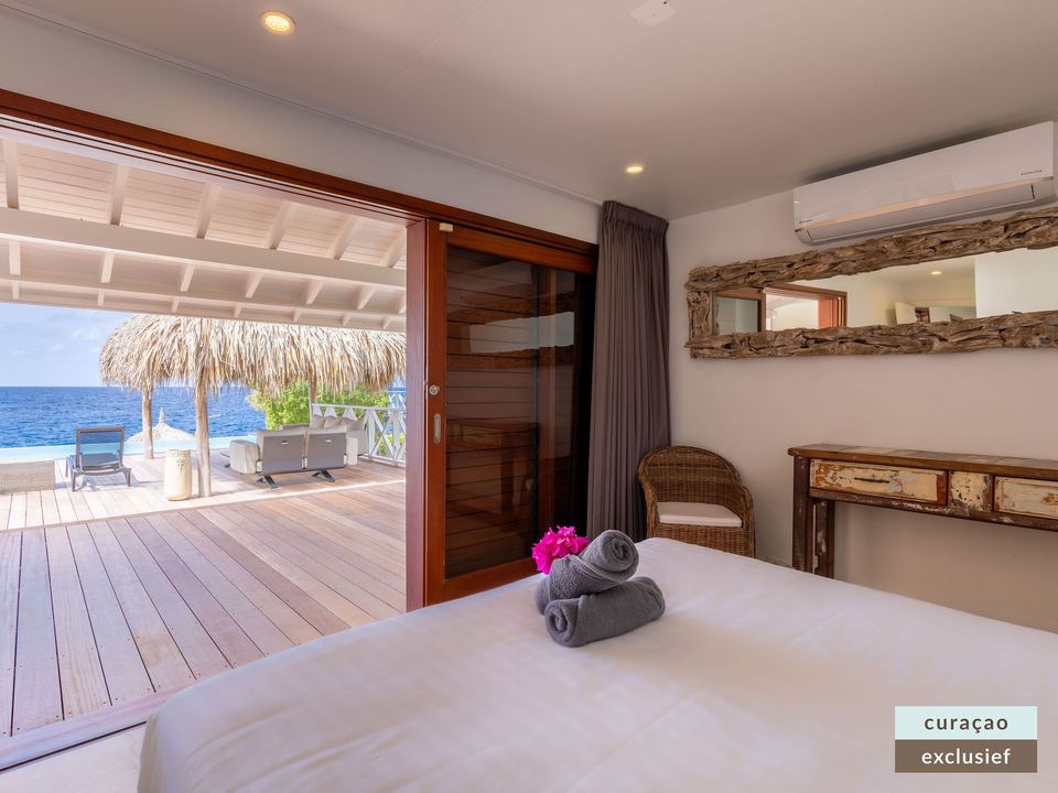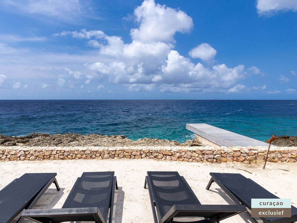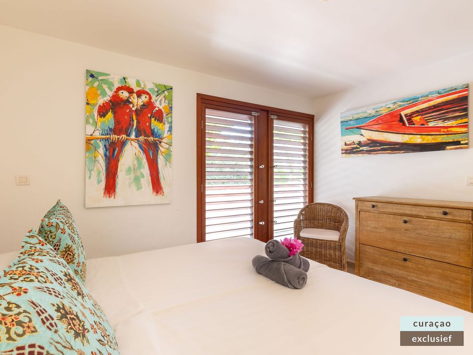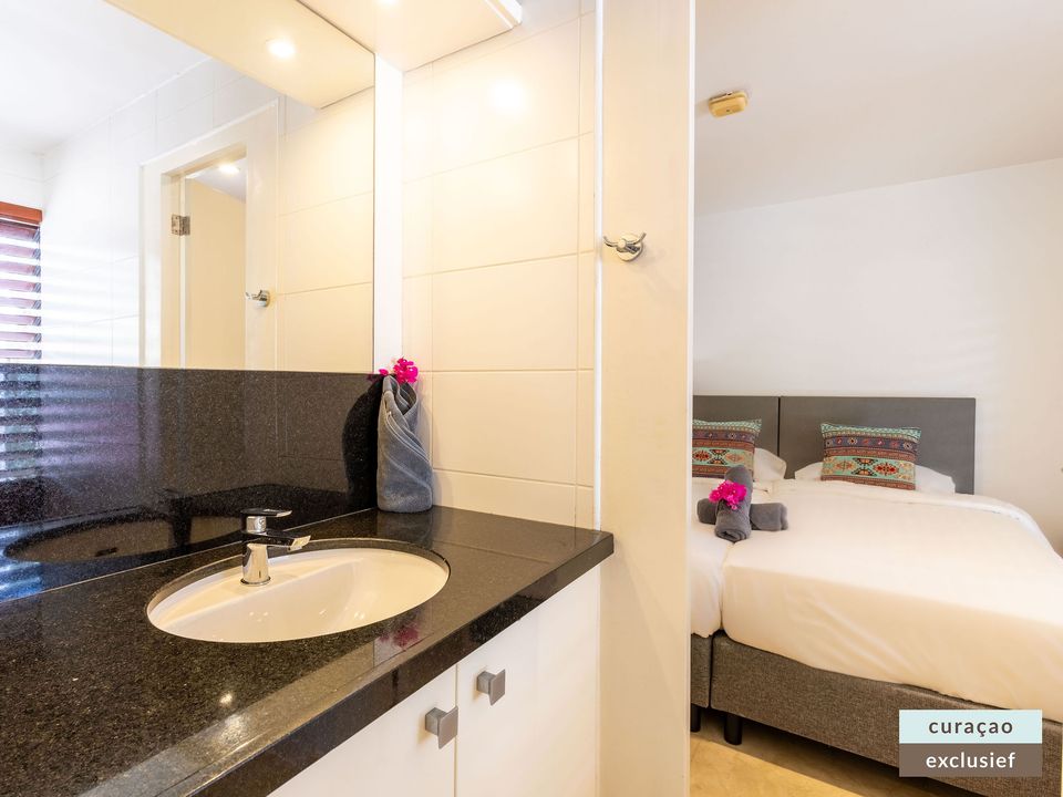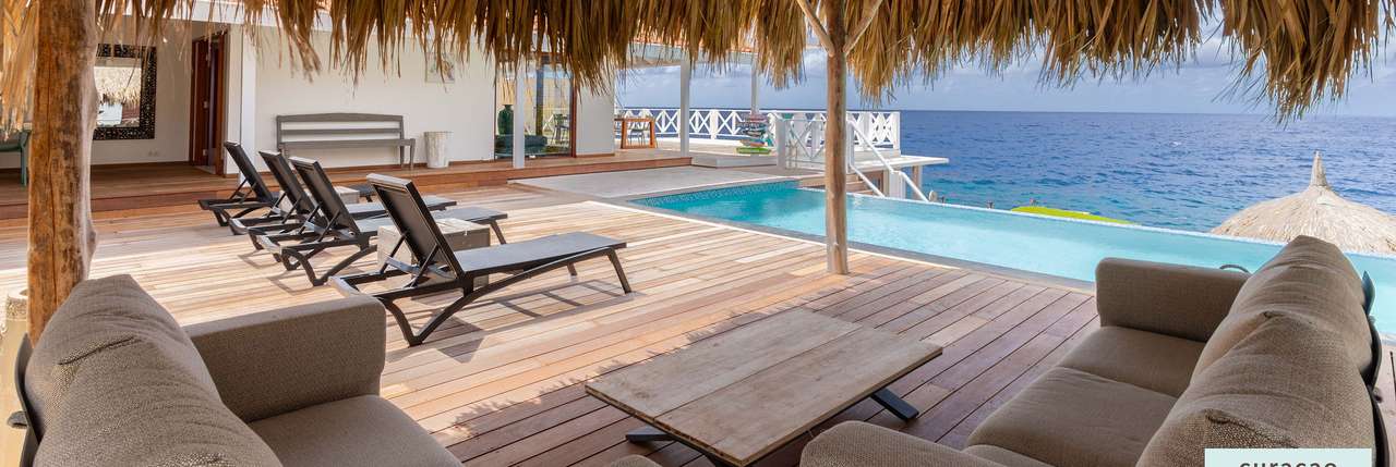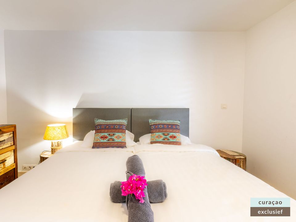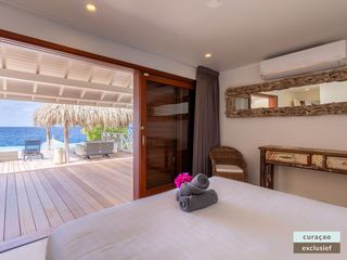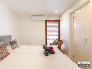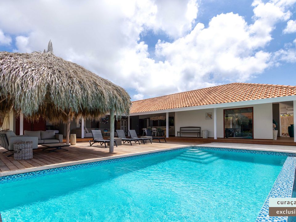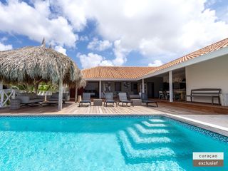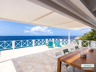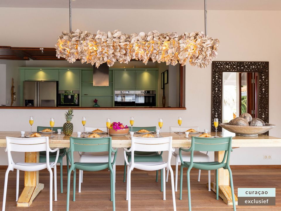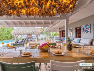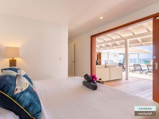 Die Villa verfügt über ein großes Wohnzimmer und ist mit einem Flatscreen TV mit Netflix und Sonos 5 Lautsprecher (tragbar) ausgestattet. Vom Wohnzimmer aus gelangen Sie auf die überdachte Veranda und die große Terrasse verfügt über eine mit Segeltuch überdachte Pergola. Von hier aus blicken Sie bis nach Willemstad.
