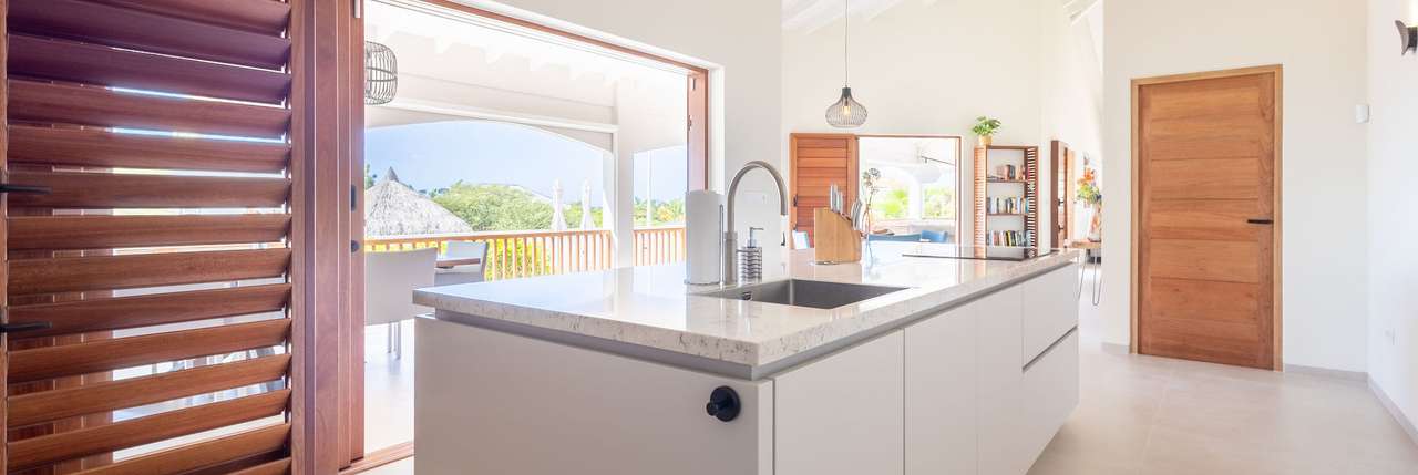 The villa feels cool and spacious on the inside because the high ceilings and light interior. The open kitchen is very well equipped with a big American fridge with an ice cube machine, dishwasher, microwave, combi oven, Airfryer and Nespresso machine.