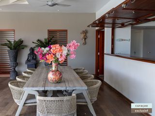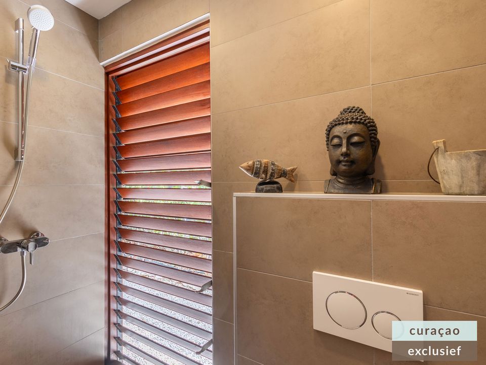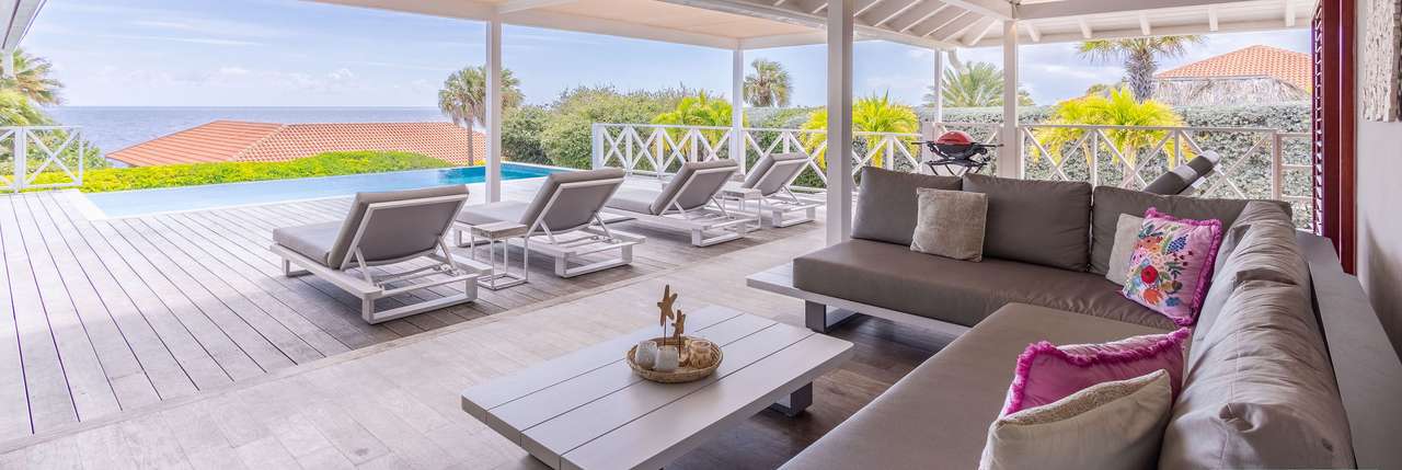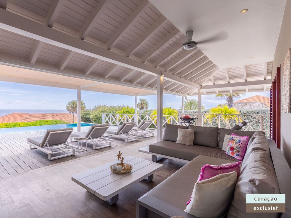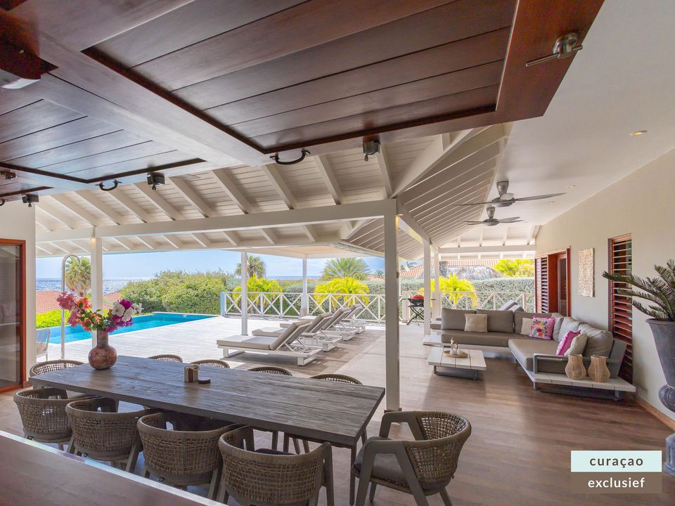 Buiten kunt u volop genieten op de ruime veranda met een comfortabele zithoek, een grote 10-persoons eettafel, BBQ en zes luxe ligbedden met extra dikke kussens rondom het zwembad. De aanwezige plafondventilatoren zorgen te allen tijde voor een aangename verkoeling.